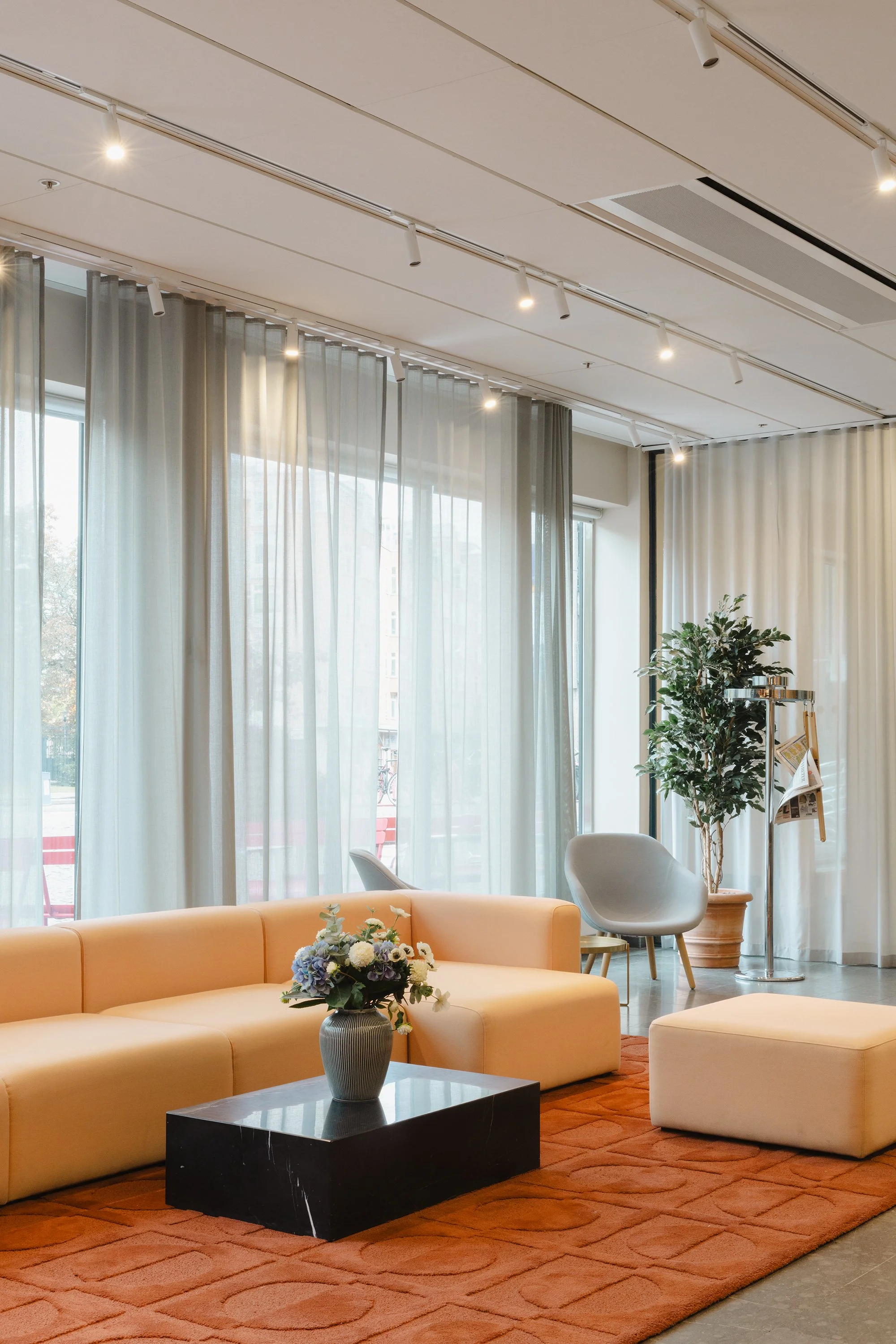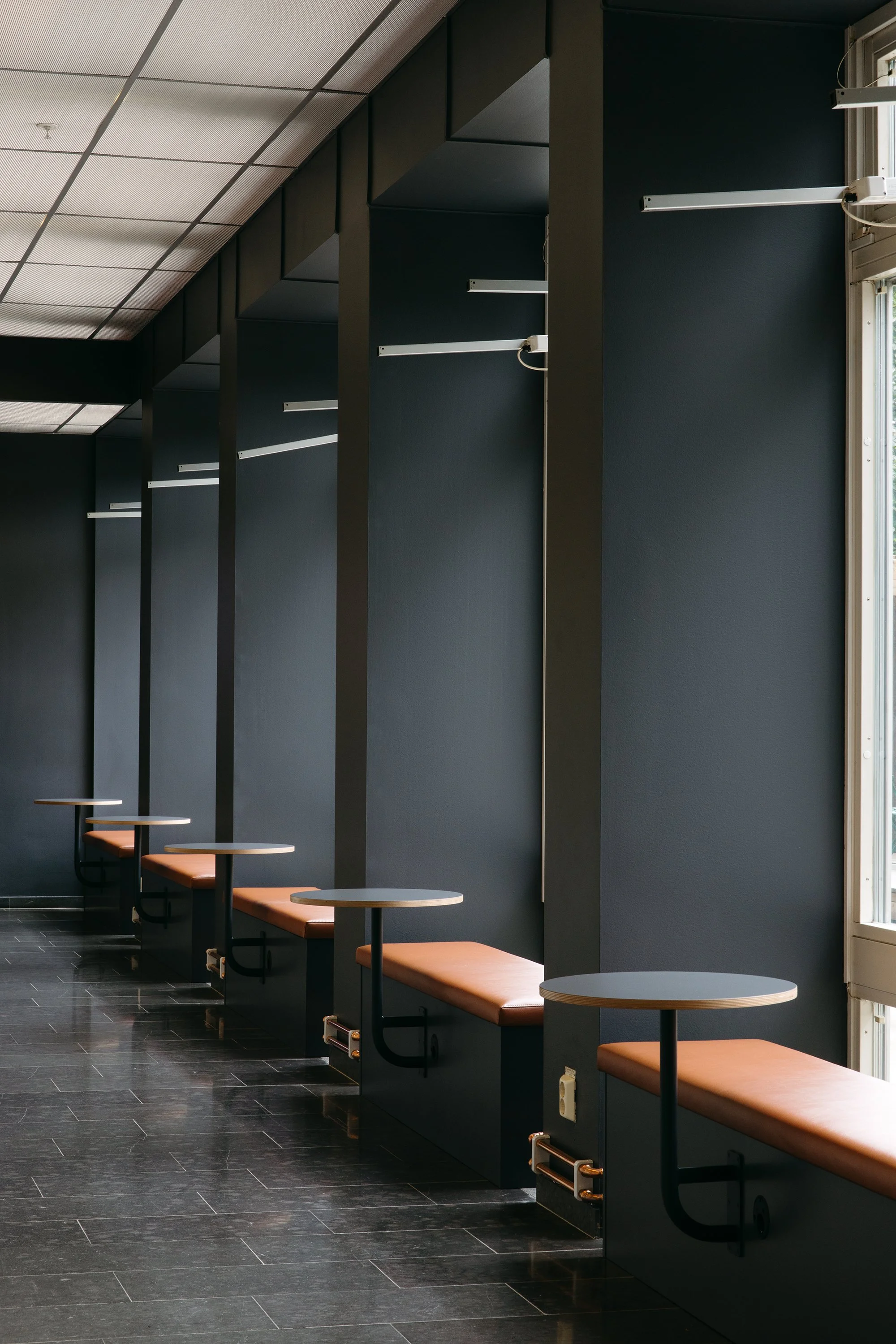 En viktig del i omvandlingen var det medvetna arbetet med återbruk. Den befintliga receptionsdisken och flera av möblerna togs tillvara, flyttades och anpassades till den nya planlösningen. Genom att kombinera det återbrukade med noggrant utvalda kompletteringar, uppdaterad teknik och integrerade installationer kunde både uttryck och funktion lyftas. Det skapade inte bara en mer hållbar lösning, utan också en miljö med större djup och karaktär.