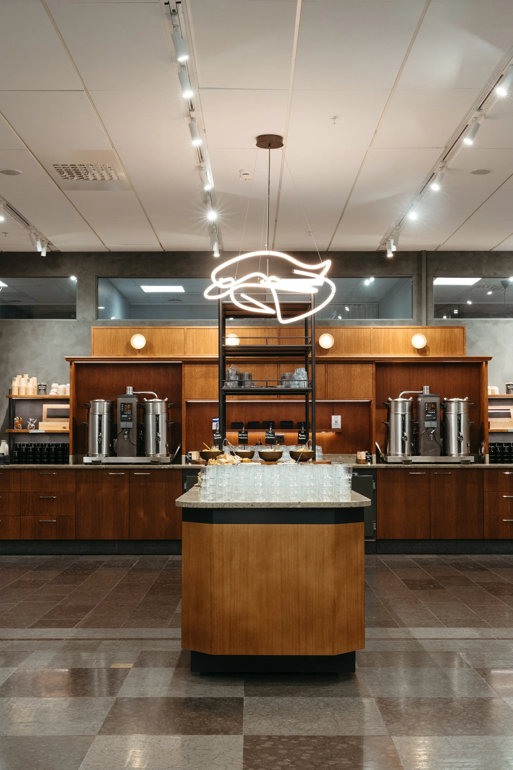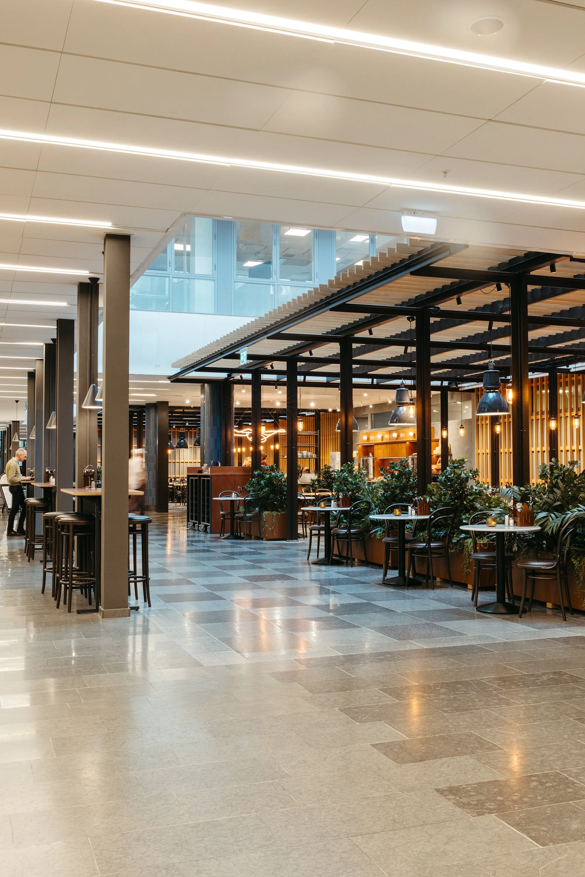 När Areim tog över utvecklingen av Trängkåren 7 (mer känd som DN-skrapan) fanns en tydlig utmaning i hjärtat av byggnaden: ljusgården. En kall, öppen yta som mest fungerade som genomgångszon och sällan som en plats där människor faktiskt ville stanna. Målet blev därför att förvandla den till något helt annat – en varm, välkomnande och pulserande samlingspunkt. Under ledning av projektledare Camilla Nilsson skapades en miljö där funktion möter trivsel. Nya materialval, akustiska förbättringar och omsorgsfull belysning förvandlade rummets karaktär. Tillsammans med Areim och de befintliga hyresgästerna formades en yta som både känns inbjudande och användbar, oavsett om man kommer för ett möte, en paus eller ett spontant samtal. Ljusgården är idag något helt annat än den tidigare var: en plats där människor faktiskt vill vara. En självklar mittpunkt i fastigheten – och ett symboliskt bevis på vad som händer när estetik, funktion och samverkan förenas.